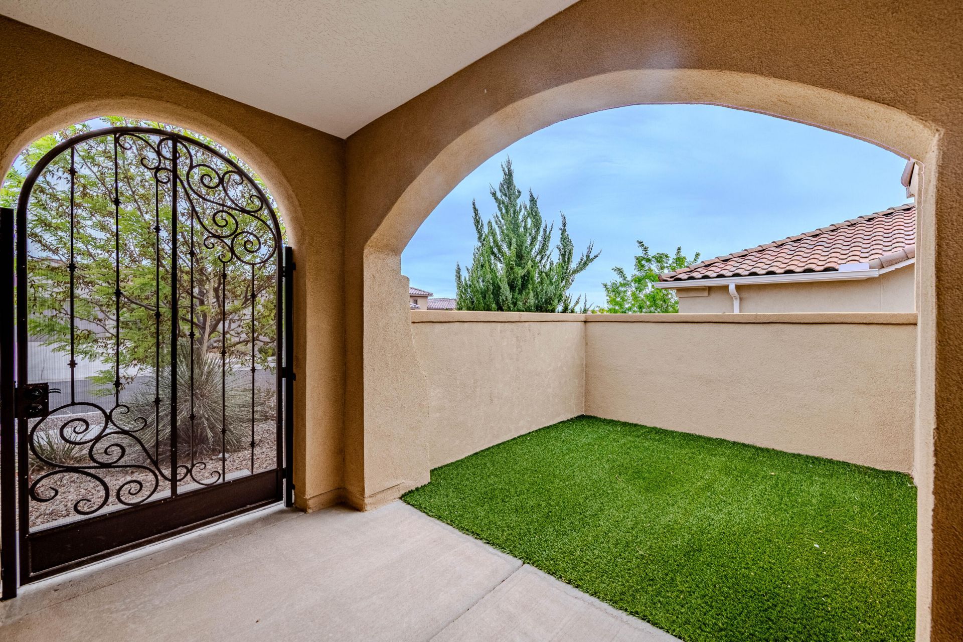 As soon as you enter your new home through the beautiful custom gate into your private courtyard you will feel right at home in your better than new 2 bed/2 bath home. Oversized finished garage with epoxy flooring and extra storage area or golf cart parking, Owned water softener, tankless water heater with recirculating instant hot water, and filtered water at the sink, this home has all the amenities to be your forever home! Extra large dining room leads out to the extra large covered patio with gas fireplace. The backyard is ideal for entertaining or just enjoying our New Mexico weather, TWO pergolas (with shades) and beautifully landscaped space featuring high quality turf and greenery surrounding you this easy maintenance backyard will blow you away!